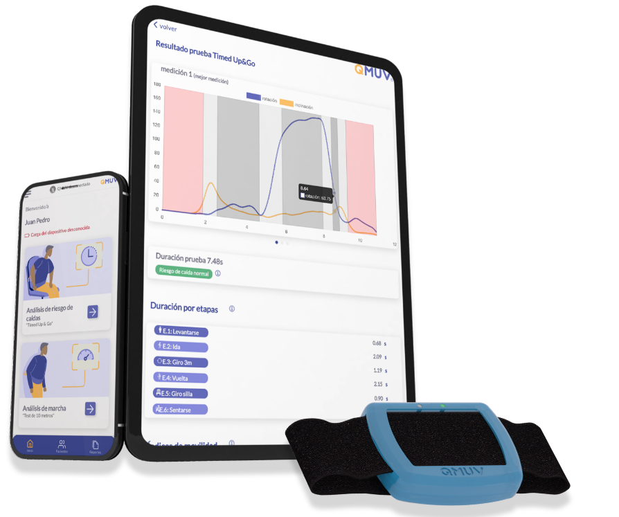 QMUV entrega a los profesionales de la salud un nuevo enfoque para el análisis de movimiento: un sensor inalámbrico especializado que permite estandarizar diferentes pruebas clínicas como el «Timed Up and Go» y el «Test de Marcha de 10 metros».